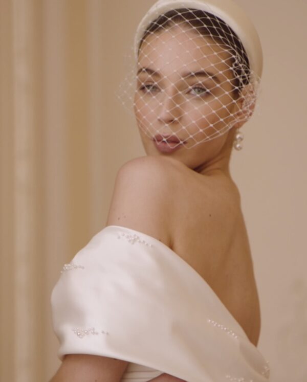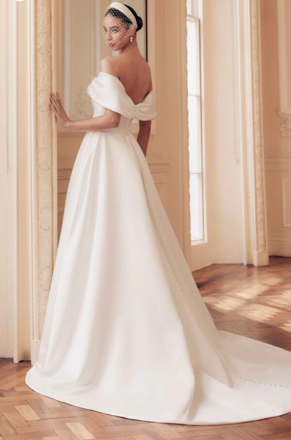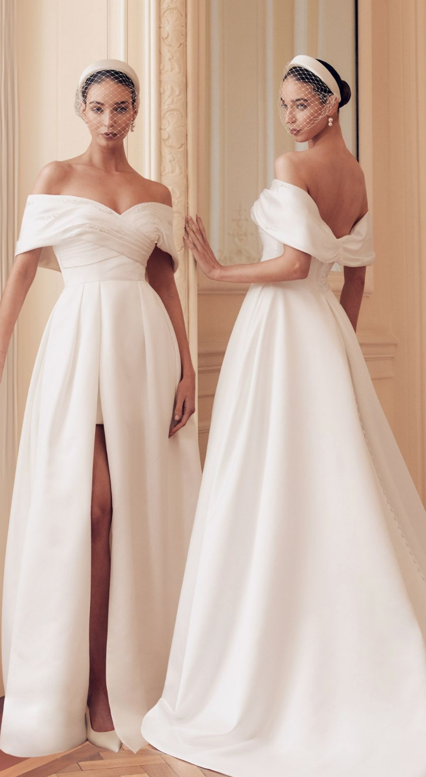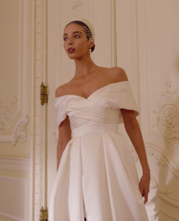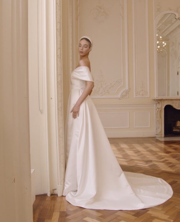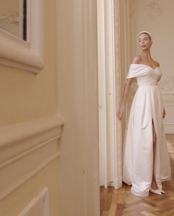 Regal and refined, Amara is crafted in lightweight matte satin that flows with effortless grace. Her off-shoulder Bardot neckline is pleated for flattering structure, while an internal corset cinches the waist and enhances the silhouette. A dramatic yet lightweight A-line skirt cascades elegantly, featuring a daring split with a mini skirt underneath for a modern twist. Brides may choose delicate beaded clusters on the bodice for subtle sparkle, or leave it clean for minimalist glamour. Amara is the perfect gown for a bride seeking understated luxury with a touch of drama.