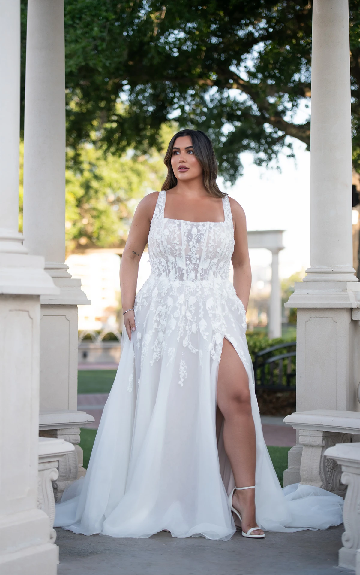 Get swept away in the fairytale romance of Style D4030, a romantic A-line plus size wedding dress of elegant lace, tulle, royal organza and 3D floral lace appliqués. From embellished shoulder straps, a classic square neckline introduces a sheer corset bodice with pearl button closures in the back. From the waist, the timeless A-line silhouette softly skims the figure, opening at the thigh for an alluring leg slit as delicate lace appliqués scatter across flowy layers of tulle. With its blend of classic elegance and contemporary edge, this plus size square neck wedding dress promises an entrance as alluring as it is ethereal for the bride who dreams of infusing romantic wonder into their special day.