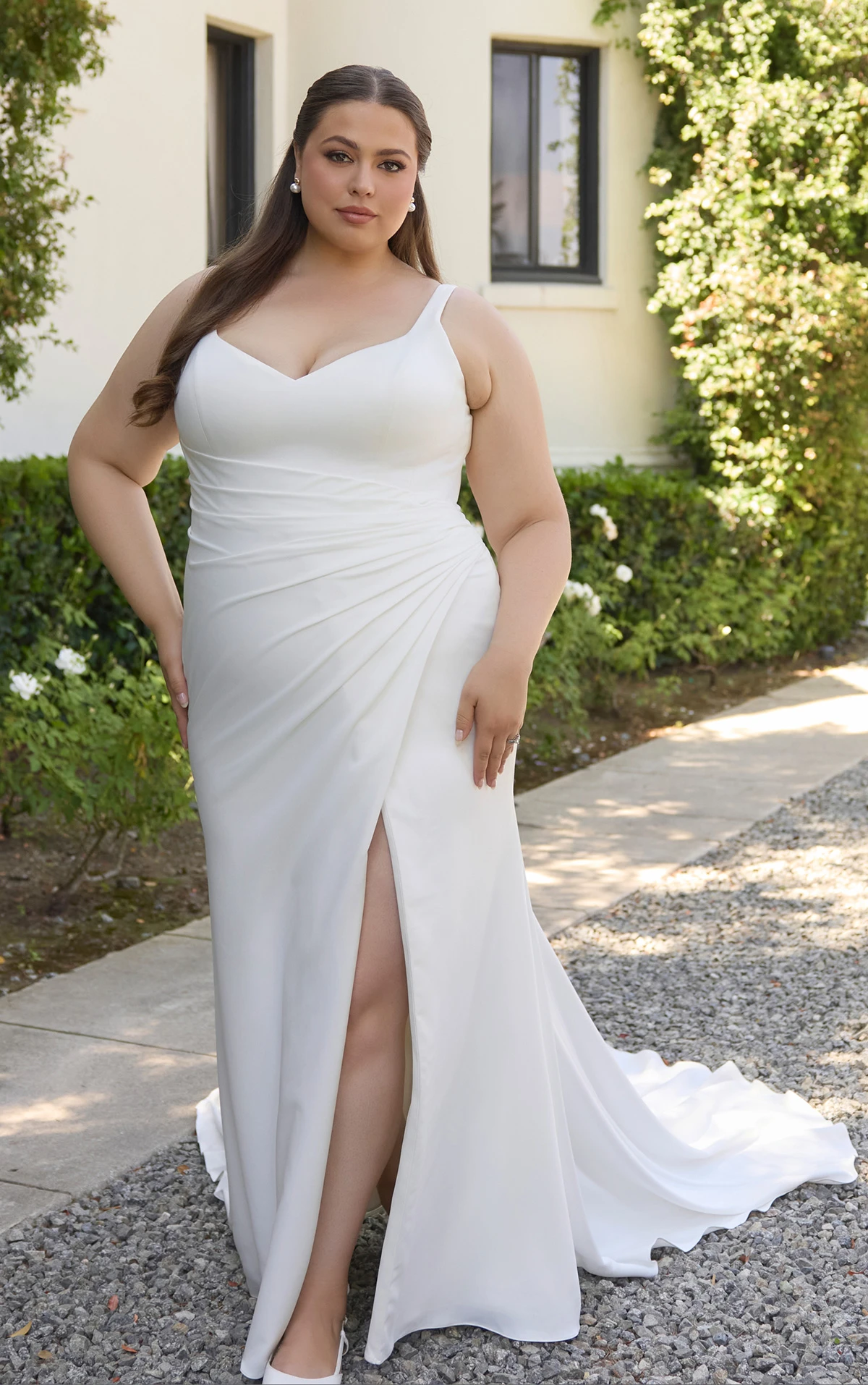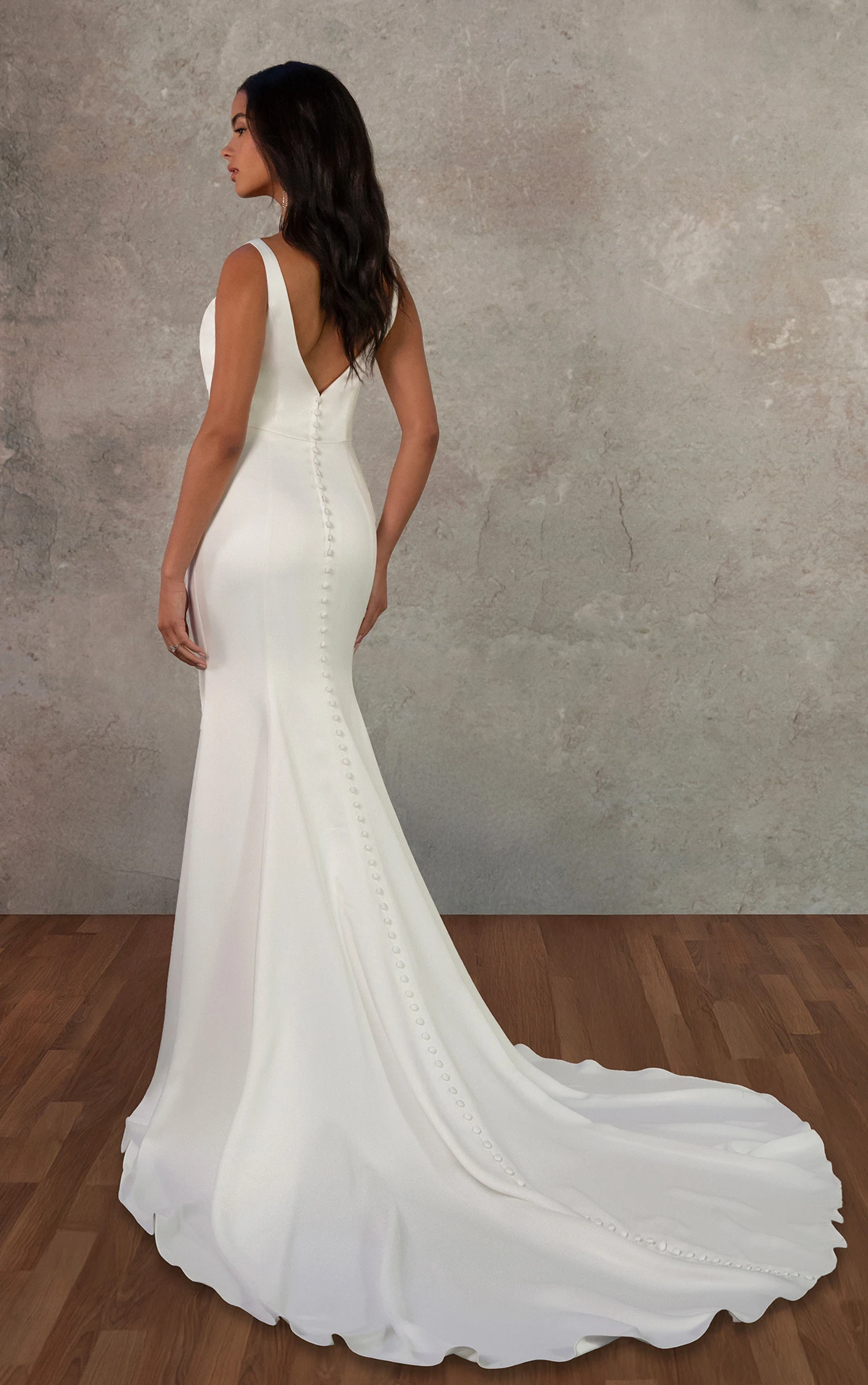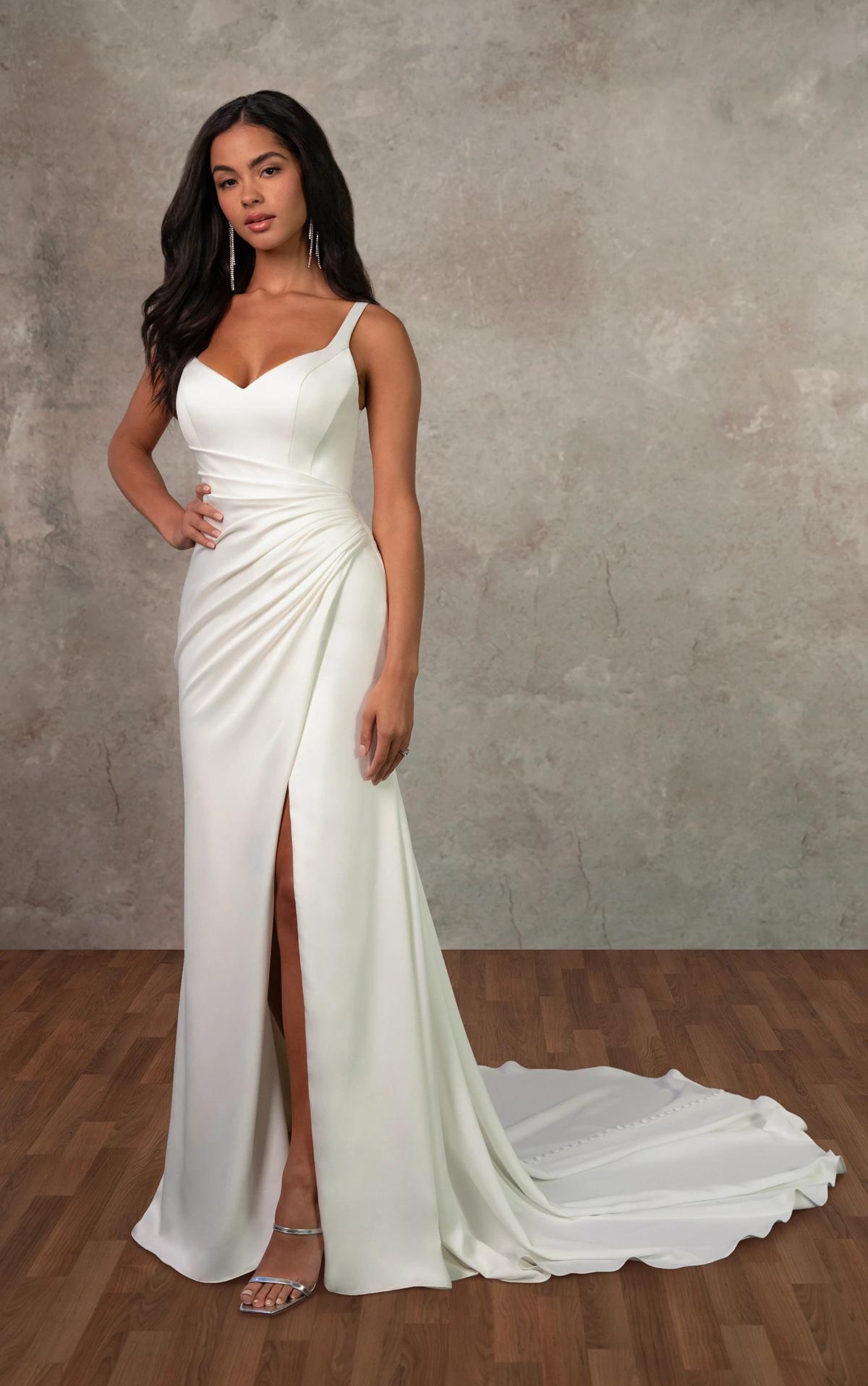 Style D4439 is a sleek and sophisticated column gown crafted from soft satin that gently skims the body for a flattering, contoured silhouette. The modified sweetheart neckline and delicate straps frame the bodice, while asymmetrical pleating and princess seams add texture and shape across the torso. A high leg slit offers ease of movement, balanced by the clean, elongating lines of the sheath silhouette. The look is finished with a V-back and fabric-covered buttons that trail down to the hem, creating a timeless yet modern bridal statement.