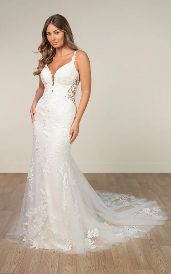 Inspired by the beauty of the natural world, Style SY8168 is a fit-and-flare wedding dress that combines bold detail with effortless elegance. Graphic lace appliqués highlight the plunging V-neckline and straps while illusion side cutouts add a sultry touch and contours the waist. The fitted bodice flows into a sleek skirt, lined with a layer of glitter tulle for subtle sparkle and dimension. Finished with striking open back and light, sweeping train, this gown brings a fresh, nature-inspired edge to a classic shape.