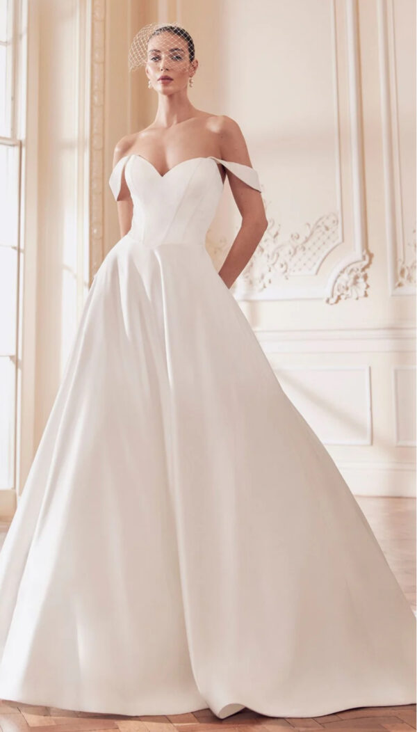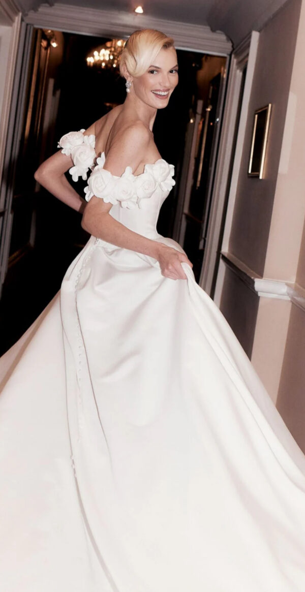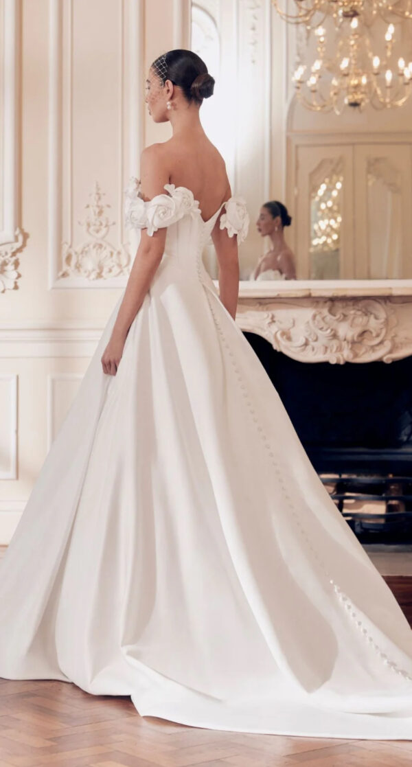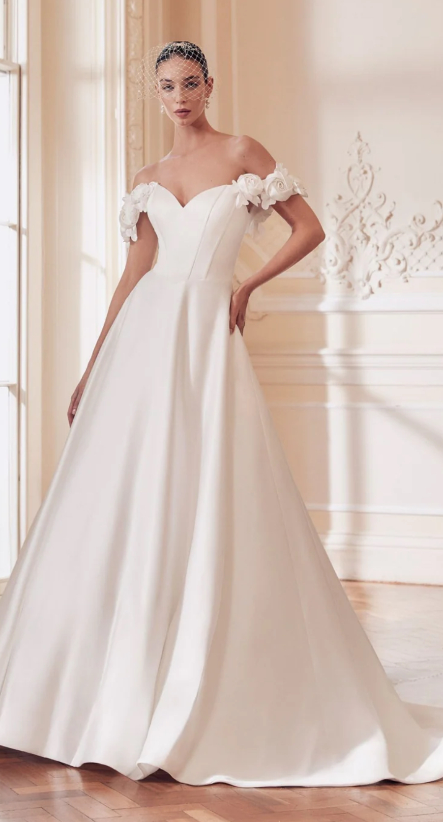 Timeless yet whimsical, Lucille sculpts the figure with a corseted satin bodice and sweetheart neckline. 3D floral straps extend over the shoulders, with an additional appliqué creating an asymmetric neckline for a unique, romantic finish. This versatile design allows brides to shift seamlessly from ceremony to celebration, with sculptural detail that adds dimension while maintaining elegance. Lucille is a gown for those who love floral artistry, romance, and modern tailoring combined.