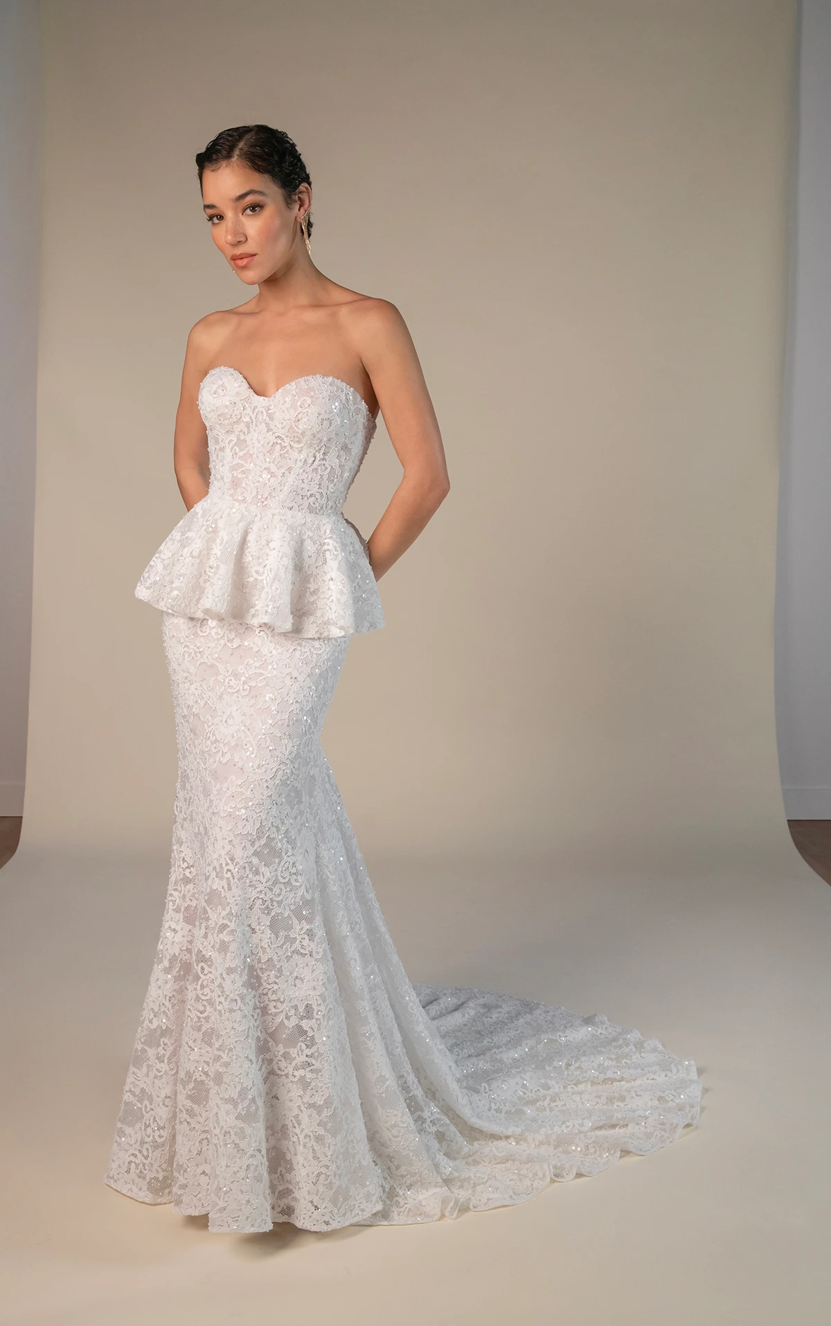 Timeless elegance and contemporary sophistication meet in the margo gown, a vintage-inspired lace wedding gown that exudes unforgettable charm. The strapless sweetheart neckline and corset fit form a sculpted bodice in sheer Chantilly lace, artfully embellished with subtle sequins and pearl beads that softly shimmer with each movement. A detachable peplum waist accessory offers a versatile bridal look for the fashion-forward bride as the fitted column silhouette hugs the figure before gently flaring at the knee to complete this glamorous vintage lace wedding gown.
