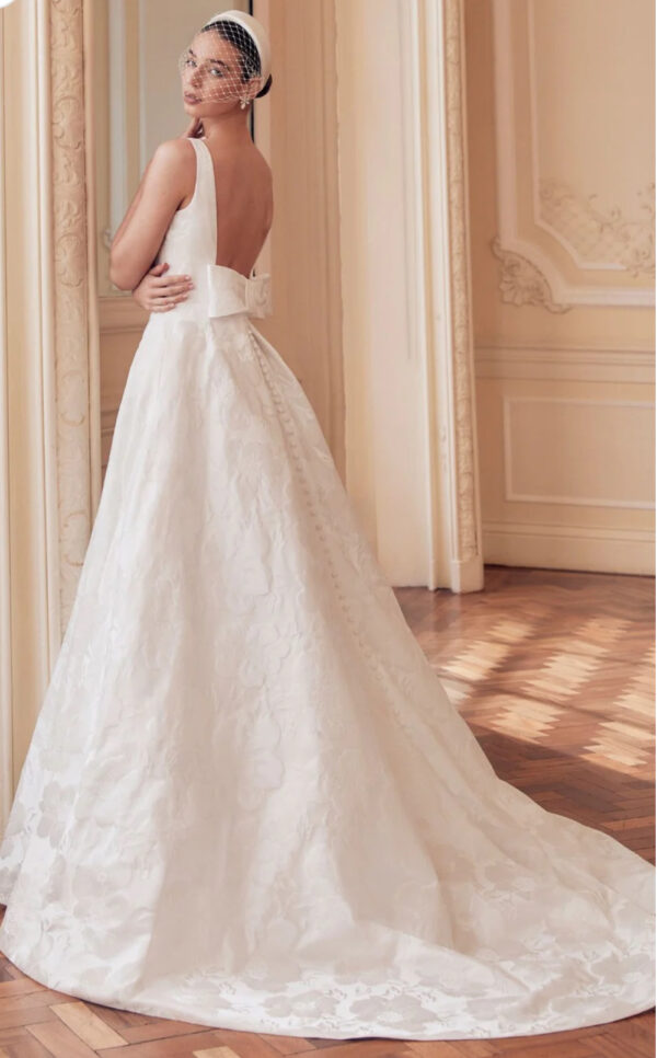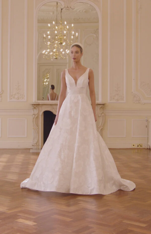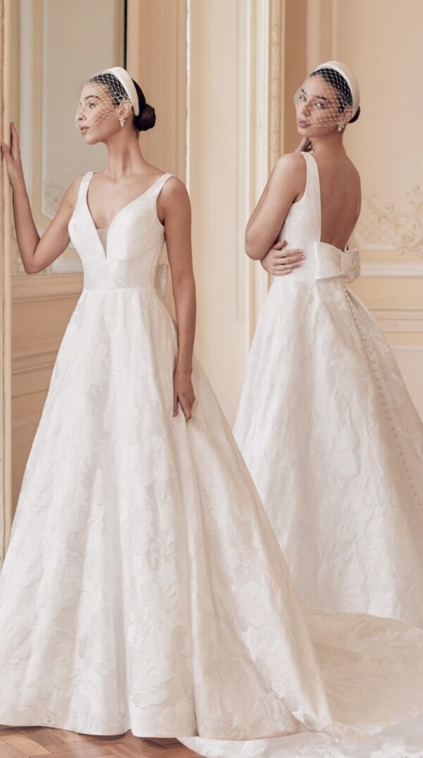 Elegant and refined, Susanna showcases luxurious jacquard in a flattering A-line silhouette. Her plunge neckline highlights the décolletage, while a wide waistband wraps underneath the bust, creating structure and drawing the eye to the waist. A detachable bow at the back adds a touch of playful sophistication, allowing brides to switch between subtle refinement and statement detail. Susanna balances classic romance with modern tailoring, perfect for brides seeking a gown that is both timeless and versatile.